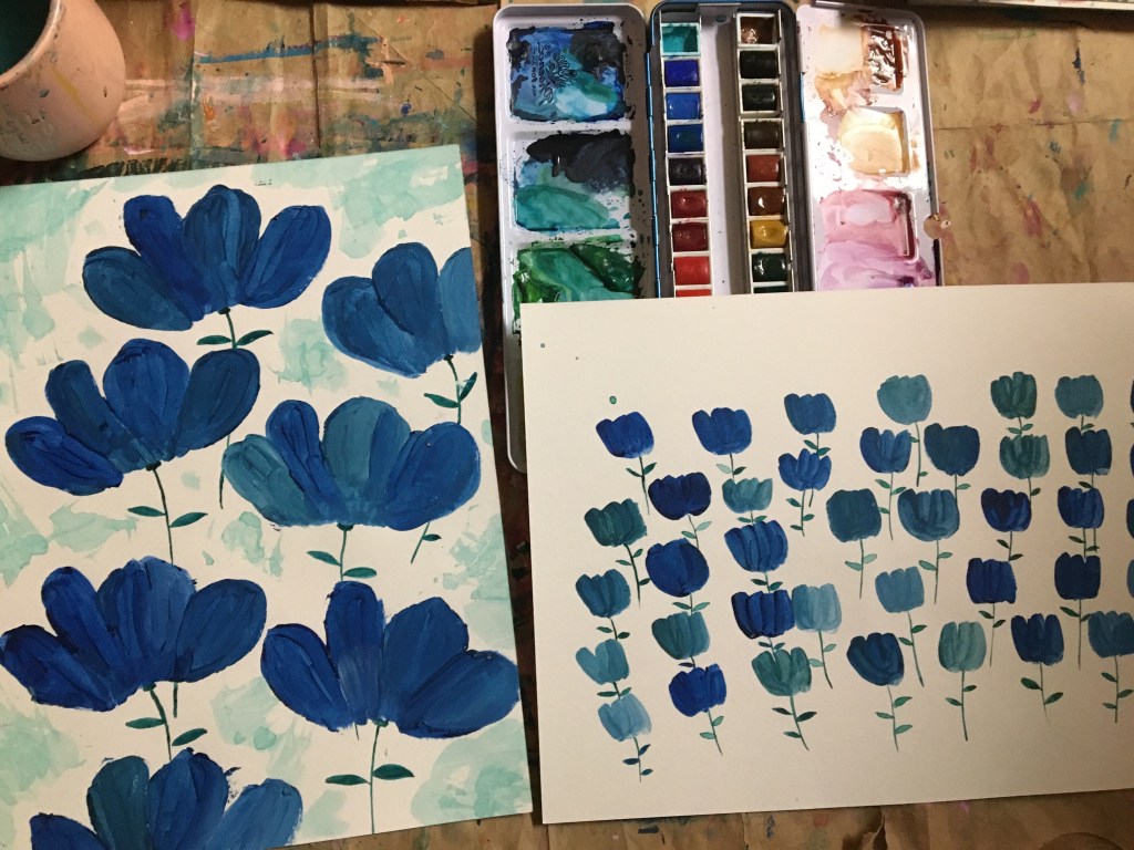 Lots of them. Using a paper roll to create a stencil was not exactly my idea. The shape was my idea. Now I have these wildflowers. Wildflowers? Wild and free with heart and all the love that breezes and blooms everything is possible. I am possible. I think wildflowers is a great name for the poem expressive of a classroom painting session. I shall write. What a wonderful idea!
