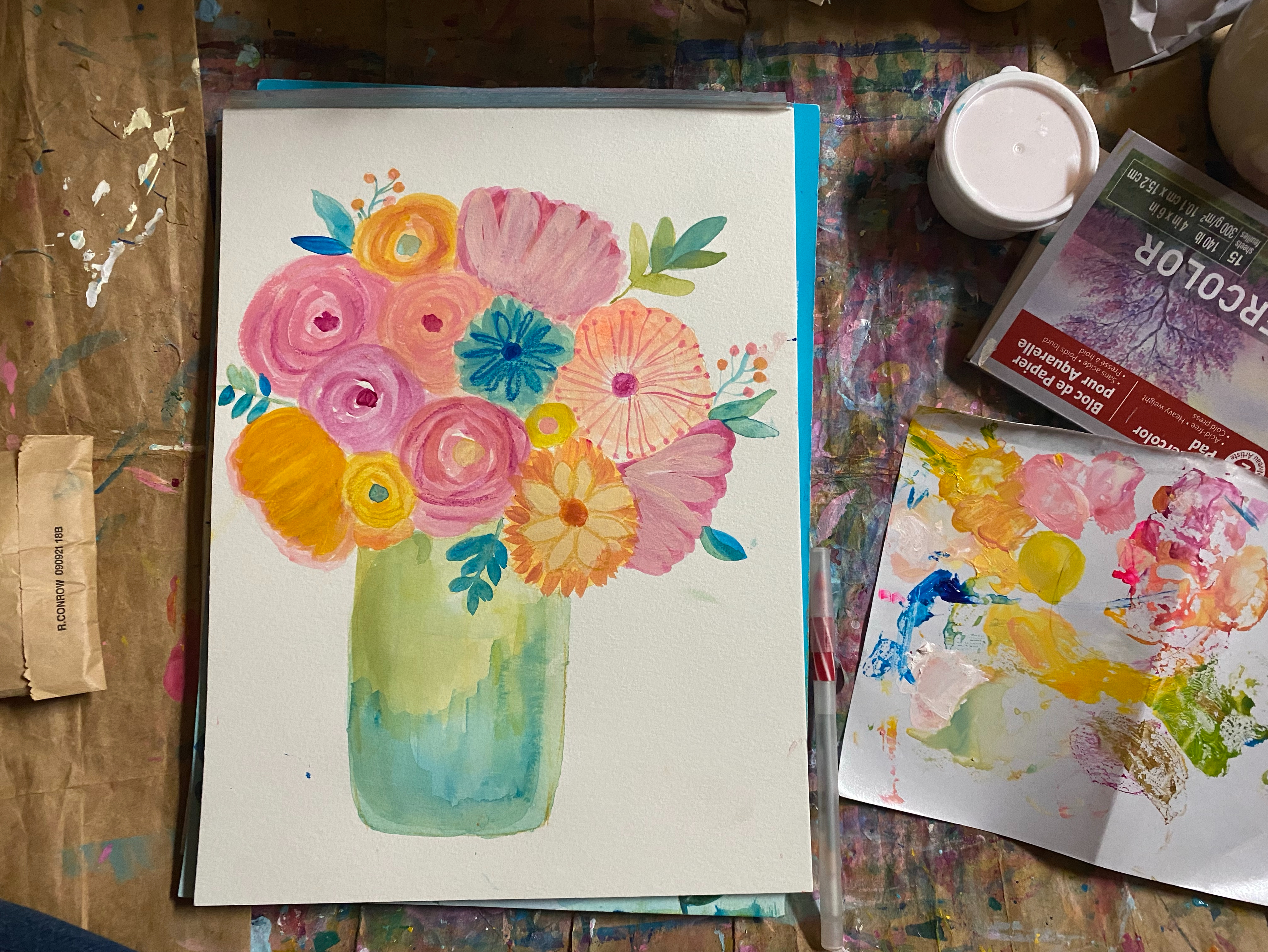 I feel like this is a bright and colorful mess? I have been painting with my Basics colors and a premium white by Utrecht. The vase looked like it was going to fall over. Still does? I made the vase bigger. That was an improvement. The colors, I don’t know what happened. I know for sure that I was overthinking everything. I had all of these thoughts on my mind that had nothing to do with painting. Maybe it was this beautiful picture? I thought too much of what it looked like. The colors moved me. The blue flower and the different flowers spoke to my spirit. I was inspired by the notion of different flowers. That’s what makes our world beautiful! I was in my place. Then distraction hit. And here I am feeling like I painted for almost two hours and nothing to show for it.