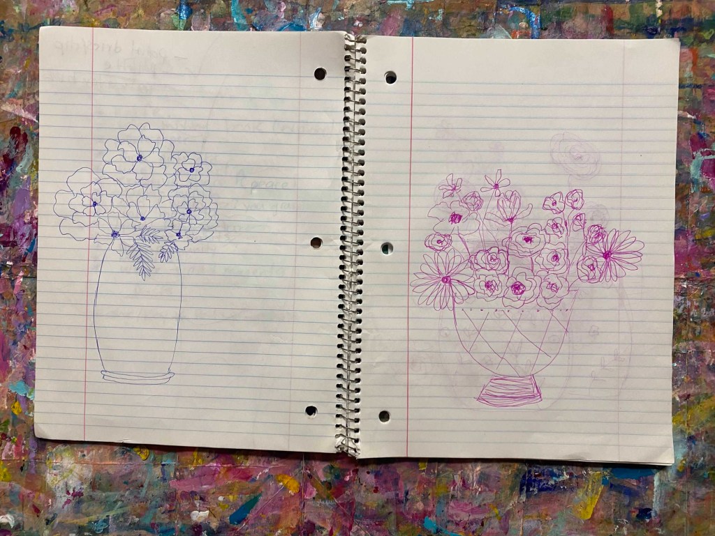 This morning I took five minutes to draw the bouquet on the left. The flowers on the right were probably drawn during the same amount of time. Drawing like this takes me to the school days of drawing in my notebook. Nobody told me to draw. I drew because…there is no reason why. I draw. I paint. I am an artist. I am an abstract flower artist.