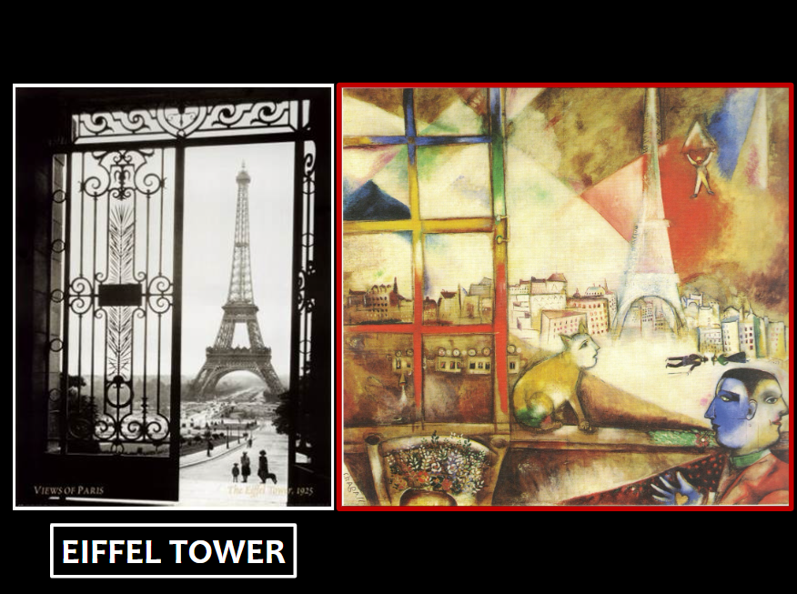 The freer the soul, the more abstract the painting becomes. These words are of Marc Chagall. Yes, what beautiful words. I had the honor of teaching a 4th-grade class about Marc Chagall. The presentation slides were colorful paintings filled with shapes and interesting texture lines. We came across a slide of the Eiffel Tower on the left and Chagall’s Paris Through the Window on the right.