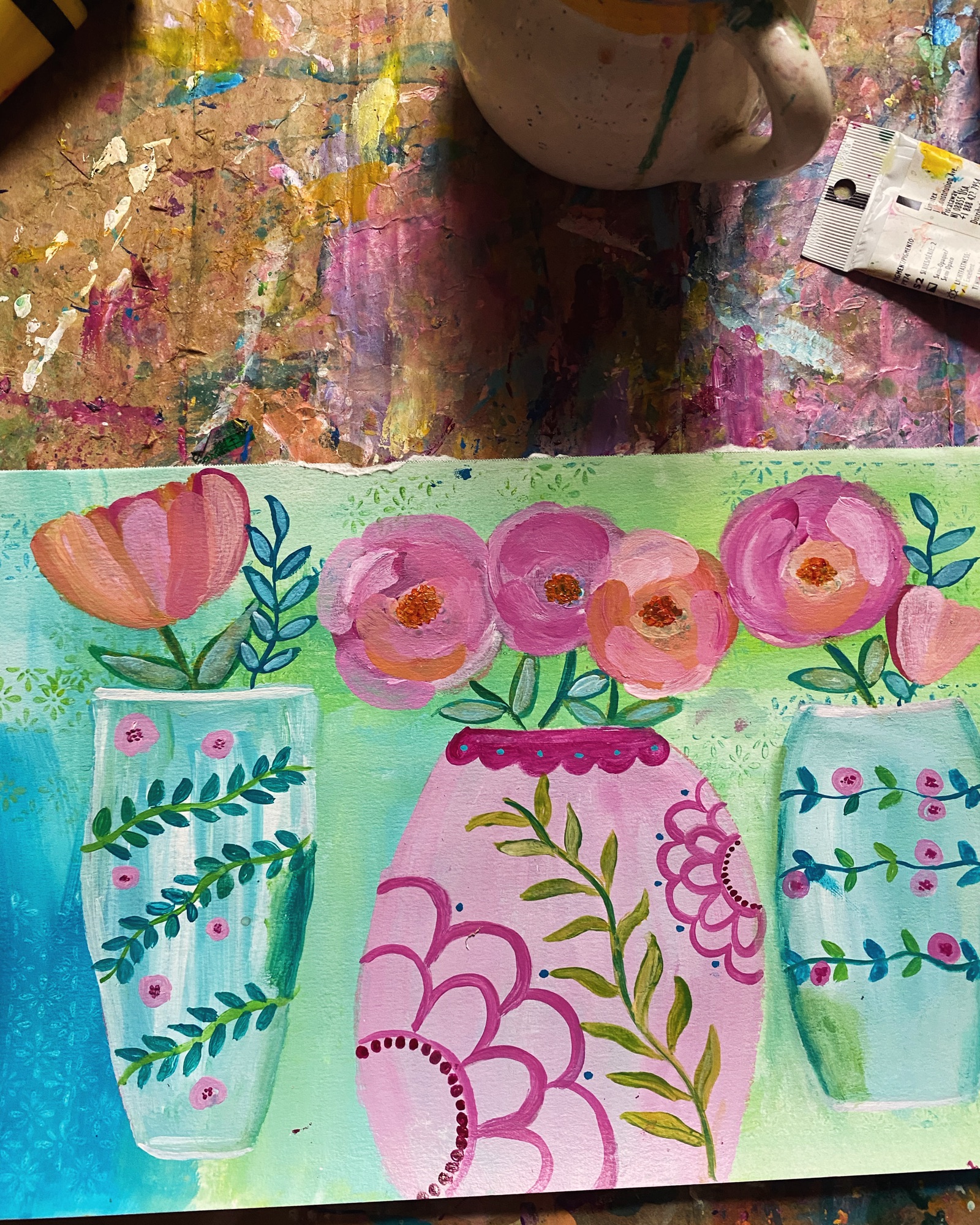 At the beginning of this post, I described my process. Three times I thought I was done. For some reason, this painting kept saying no you’re not. I had to keep going. Once I let go of comparing and doubt, magic happens. I say this all the time, so proud when I get to create with children because they just do what they do unapologetically. So embrace the mess because that is what beauty is.