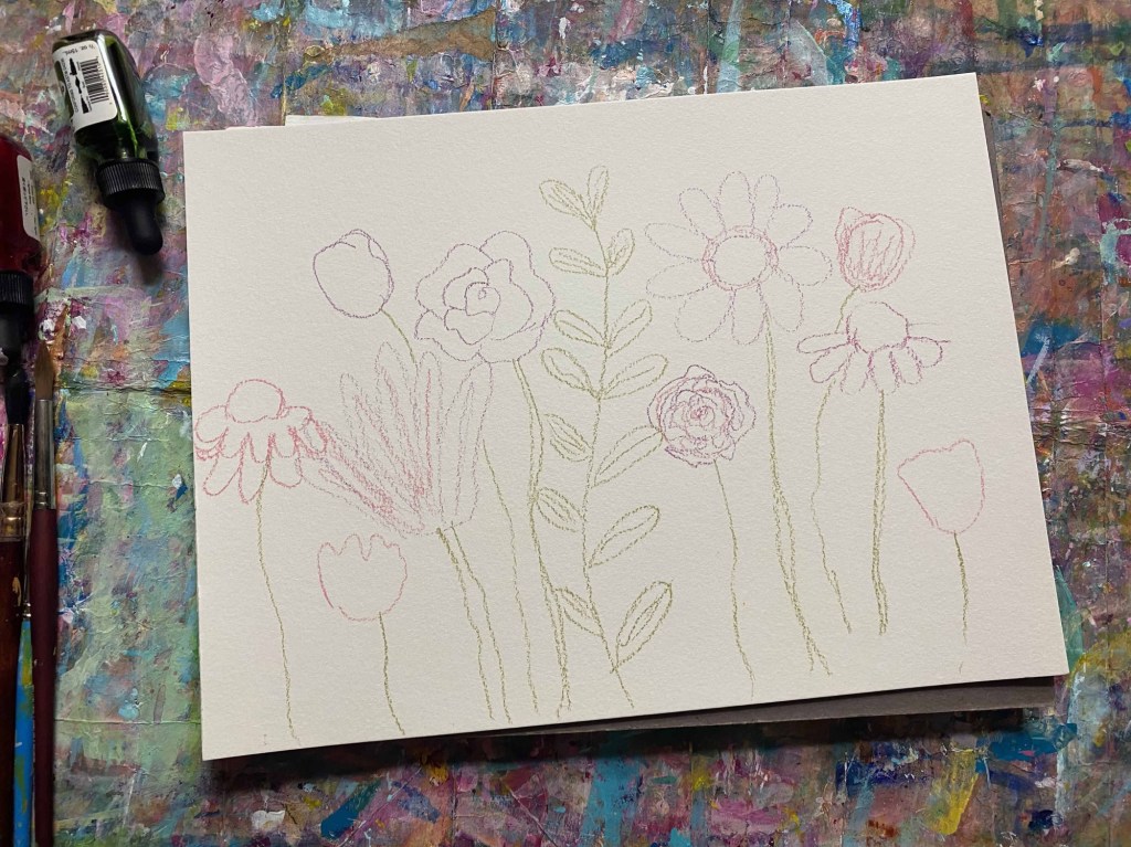 I used watercolors, acrylic paint and ink. My only idea was to paint a field of wildflowers. Sure, bright pinks were on my mind. Oh, and I have been painting with Neocolors. You take your wet brush, swipe it on the Neocolor and paint. It’s wonderful. Gold green is my favorite color to use for leaves these days. I always love teal too. Gold green has a little shimmer and shine. The pink makes these flowers pop. I want to paint pops of color that brightens up any space.