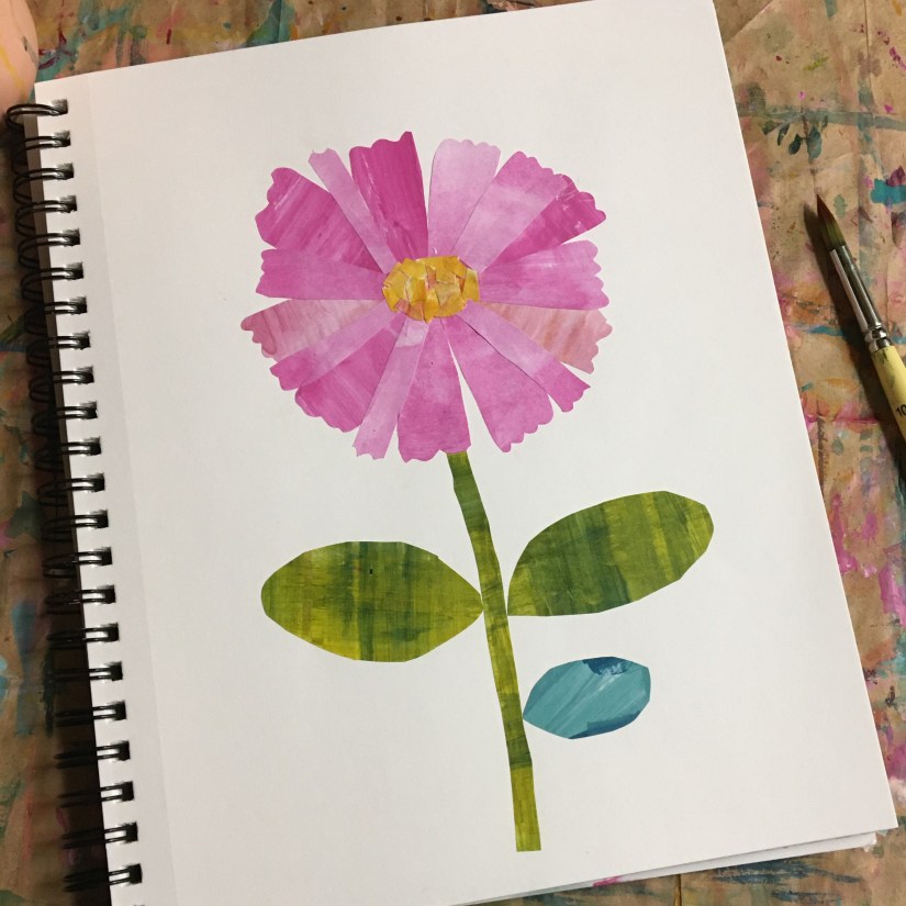 What I love most about paper collage is that you get to paint all these simple textures. You can paint with a toothbrush or a comb. You let your eyes arrange. Color comes alive. Beauty is revealed when you cut leaves or flowers. Paper collage takes longer to create. It’s easier to pick up the paintbrush and paint because there are no expectations. You explore ideas and then you look for the pieces to cut and create a flower. I rarely throw out a collage project.