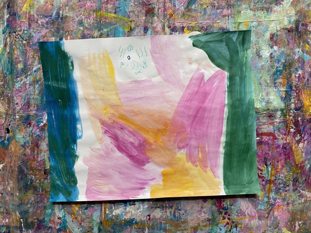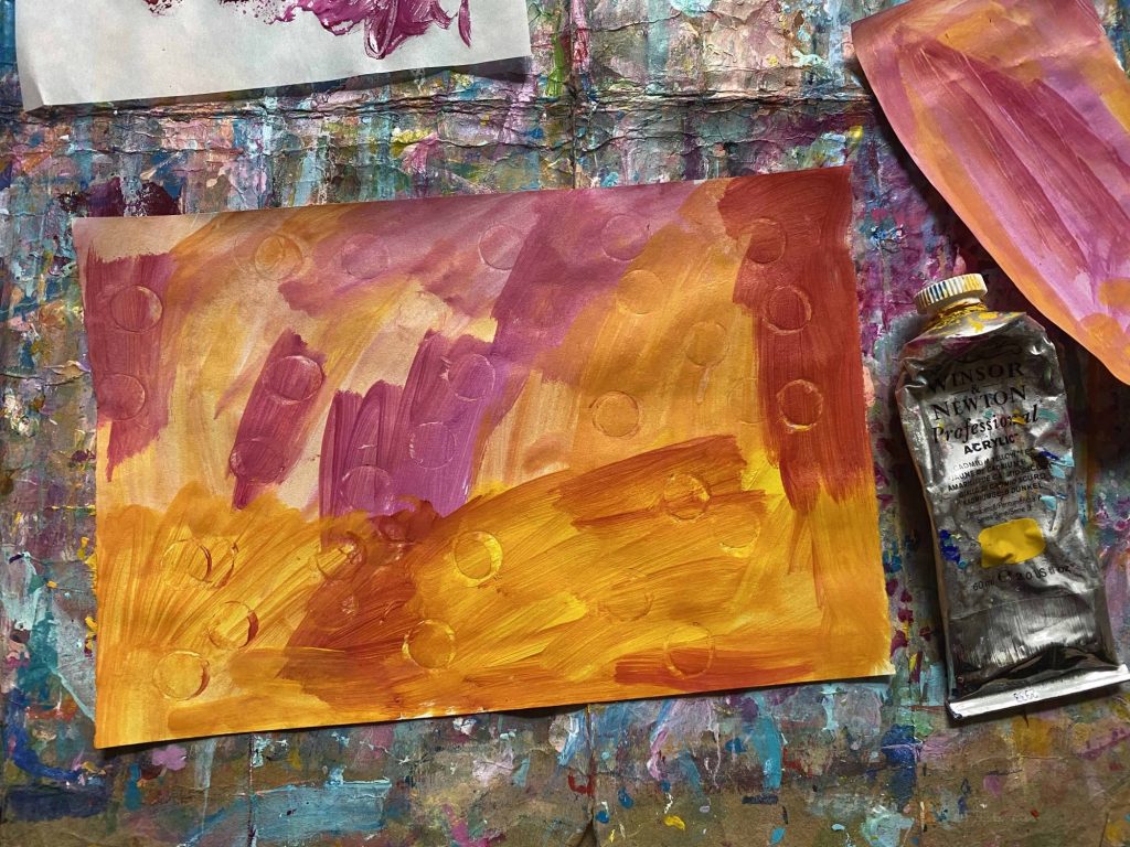 Oh my, I love how this turned out! I started with the pink texture that I created by scratching with the back of my paint brush. Self-love and hearts are what popped in my head. Then it was botanical leaves and the paintings I like to do. I may use my Posca pens to add details. Oh, light blue dots around the orange center of the flower. Perhaps!
