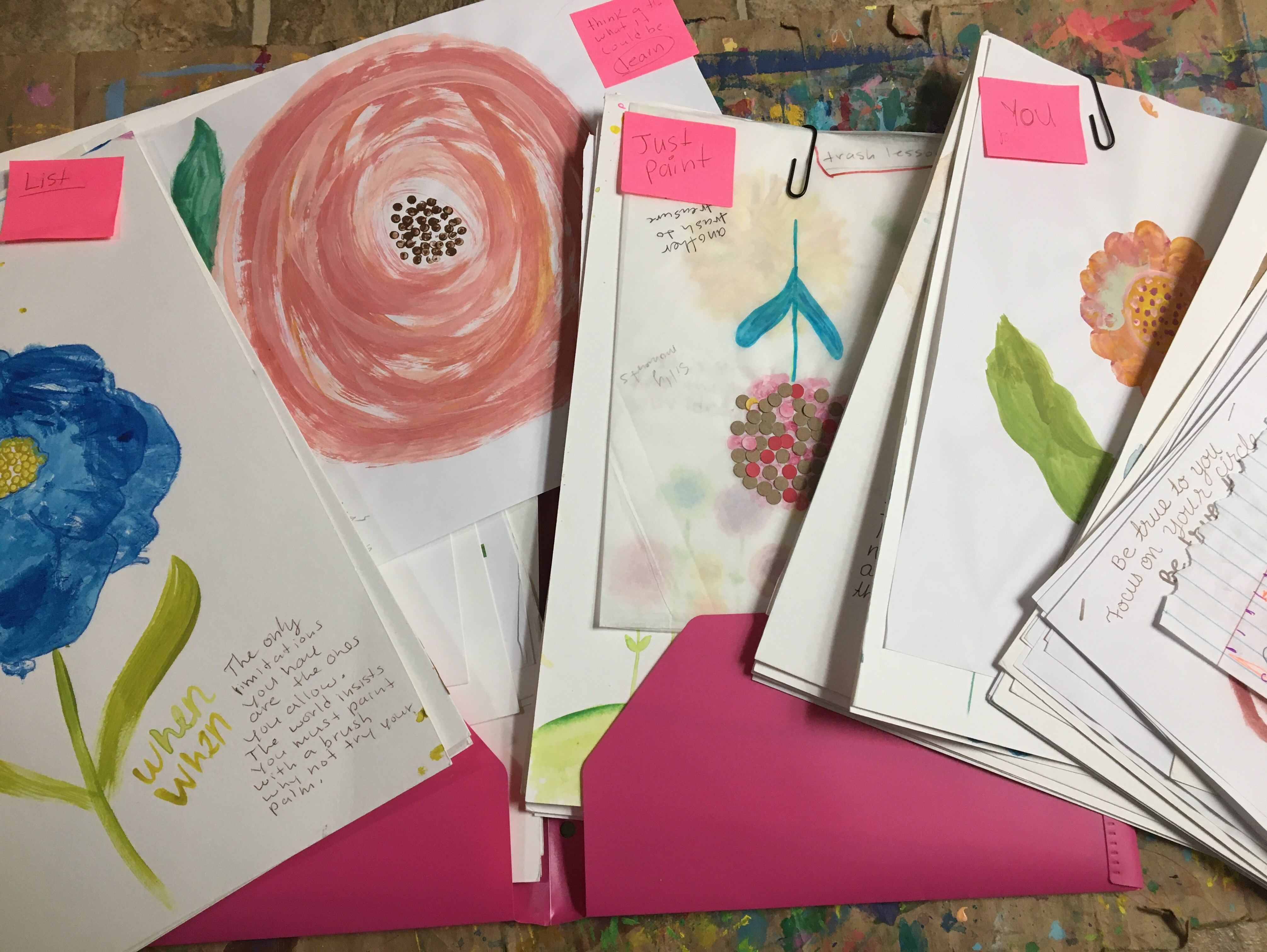 Have you ever spread out all of your sketches, drawings or paintings and then have a kid in a candy store feeling? I painted over 500 flowers using all kinds of tools. What was my goal? My goal was to surrender to the process. No idea was too silly or complex. I just wanted to take the words of Corita Kent and learn about myself and how to paint flowers.
