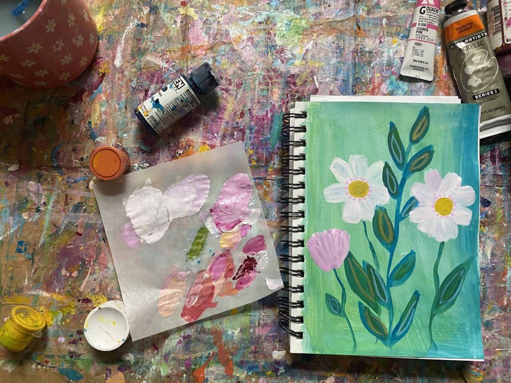 Do you have an art journal? A notebook or a fancy hard cover book filled with your drawings and paintings. I love starting a new project, loving the color I mixed, then using the leftover paint to add a pop of color to a painting on another page.