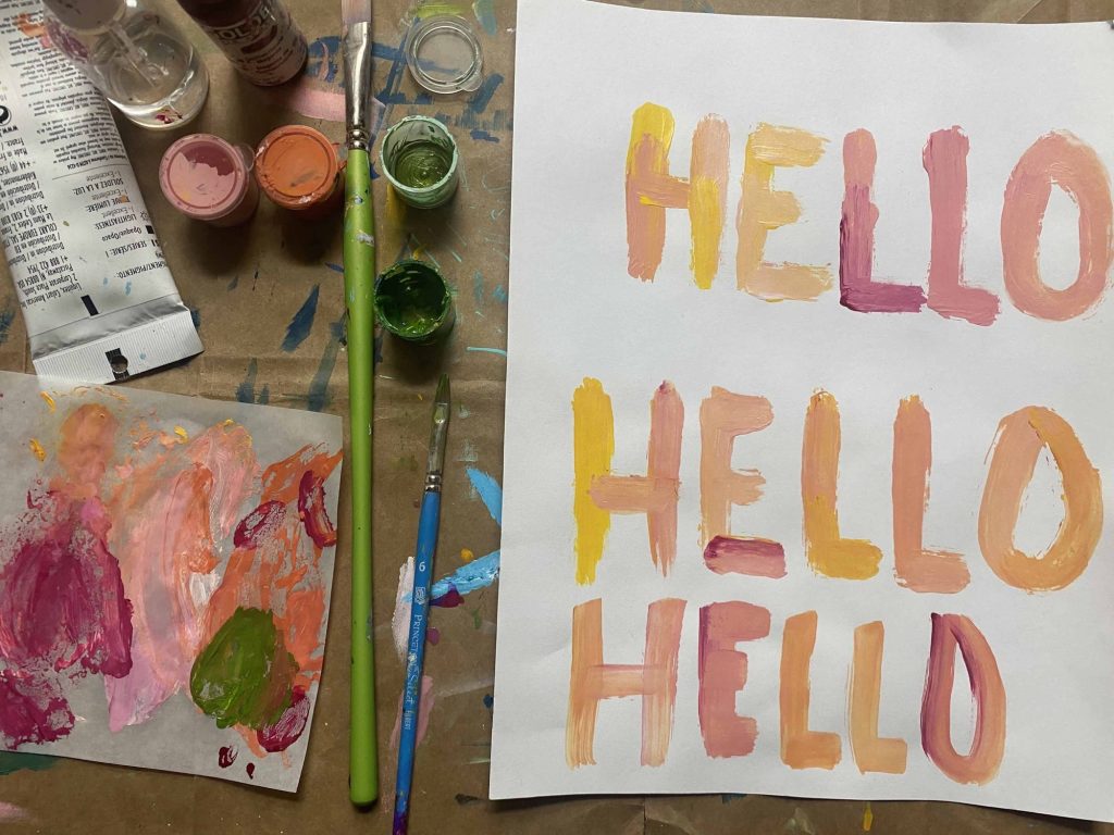 The first two words are finger-painted. The third was painted with a flat brush. What option do you like? My creative spirit says yes on the finger painting one. I just have to work on the spacing and maybe combine letters. Then there is the brush version. Maybe it’s best for this collection?