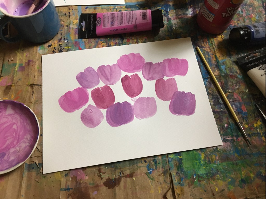 I have been thinking about purple. This is the first design I painted like a few years ago. I love the colors. What should I call them, warm purple pinks. Ok.