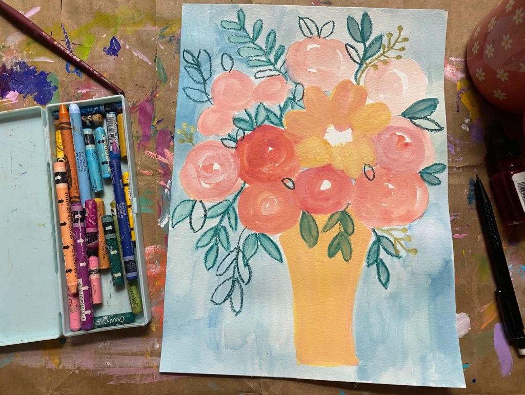 If I compare my beginning and end, I see that there really is only make. The more I make art, the rest just takes care of itself. I don’t question or doubt. What I love most about my peach roses and yellow flower bouquet is that I am excited to see what else I can come up with. The more you paint, the more creative and interesting your art gets.