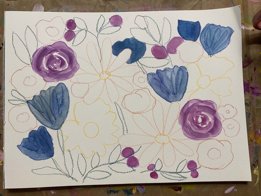 I just drew flowers the way I do. Then the layers of watercolor began.