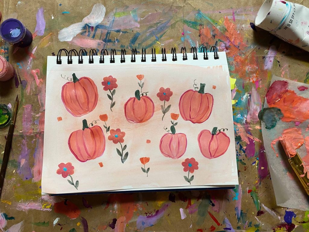 I used my fingers to paint the background and pumpkin shapes. Then I used a brush to add the details.